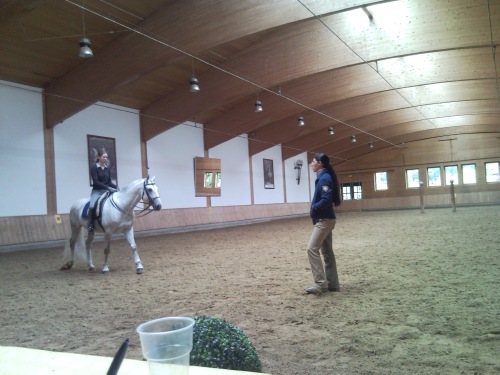 Haar trainingssysteem kwam bij iedere training uiteraard weer terug, eerst losmaken in de hals en kaken door middel van inbuigen op een volte. Het paard moet ondertreden en buigt in tot dat hij loslaat. Dit beide kanten op. Vanuit daar blijf je op de volte en laat je het paard ubertritten lässen, dit om de achterhand en voorhand los te maken.