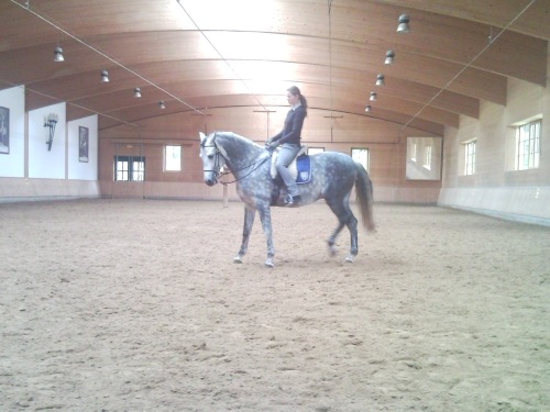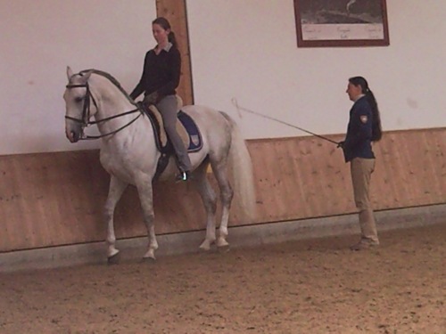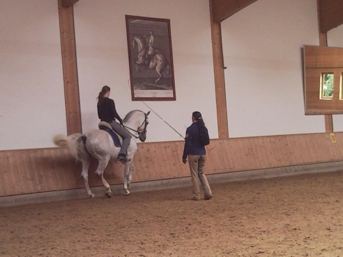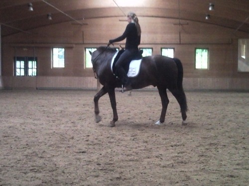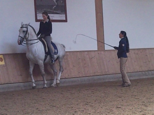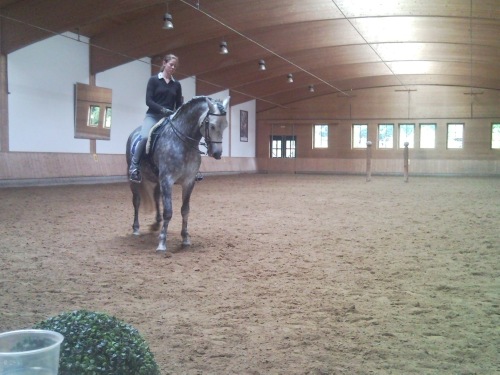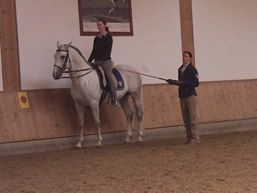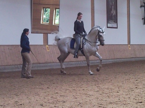 Ook hier werd weer eerst losgewerkt door middel van buigen op de cirkel en ubertritten lässen. Als je merkt dat het paard te veel gewicht op de voorhand legt zet je het paard stil en zet je hem achterwaarts om zo het gewicht naar achter te verplaatsen. Vanuit daar ga je weer verder. Dit kan iedere pas nodig zijn.