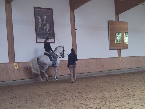 Als het paard (dit paard in dit geval) te heet wordt bij de spaanse pas moet je niet meer willen dan een aantal passen en dan het paard stil zetten of achterwaarts en vanuit daar weer voorwaarts in de spaanse pas.
