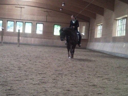 Zwarte Spaanse hengst, prachtige verschijning, erg kort en klein in zijn lichaam en heeft de hoefjes van een welsh A. Bij deze combinatie werd er aandacht besteed aan de zit van de ruiter, erg interessant.