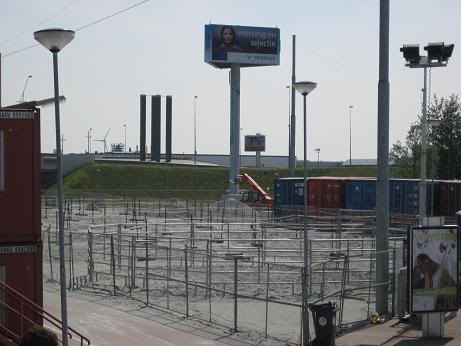 Vervolgens moet je dan langs een heeééééél lang hek lopen, om bij de ingang te komen. De doeken die aan dat hek hangen -om het zicht te belemmeren- zijn vingerlikkend mooi…