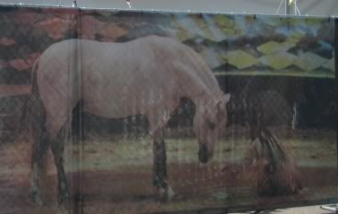 Jammer genoeg had zaterdag het paard niet zoveel zin geloof ik, want hij probeerde terug de coulissen in te duiken. Wat ik erg knap vond, was dat hij op een niet-storende manier toch uit de coulissen teruggestuurd werd (je kon niet zien hoe: je zag hem richting coulissen gaan en ineens rechtsomkeer maken) En uiteindelijk heeft het paard dan toch nog even de put-your-nose-on something gedaan