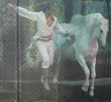De show zelf bestaat uit allerlei verschillende “acts” die plaatsvinden voor werkelijk prachtige decors en belichting. Op het begin had ik het idee, dat ze de geschiedenis van mens en paard wilden uitbeelden. Het begon met 2 losse enters in een decor van bomen en blaadjes, en later kwamen de holbewoners die achter paarden aanjaagden. Weer later werden in een decor van een Romeinse arena paardenrennen gehouden. Daarbij reden ruiters de Hongaarse post, dus in volle galop staand op 2 paarden, met één been op ieder paard. Aaargh. Daarna raakte ik “de lijn” kwijt, als die er al in zat. ( Dat wordt dus nog een keer heen![]()